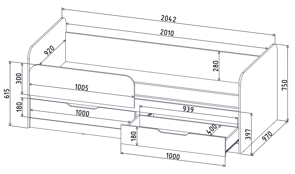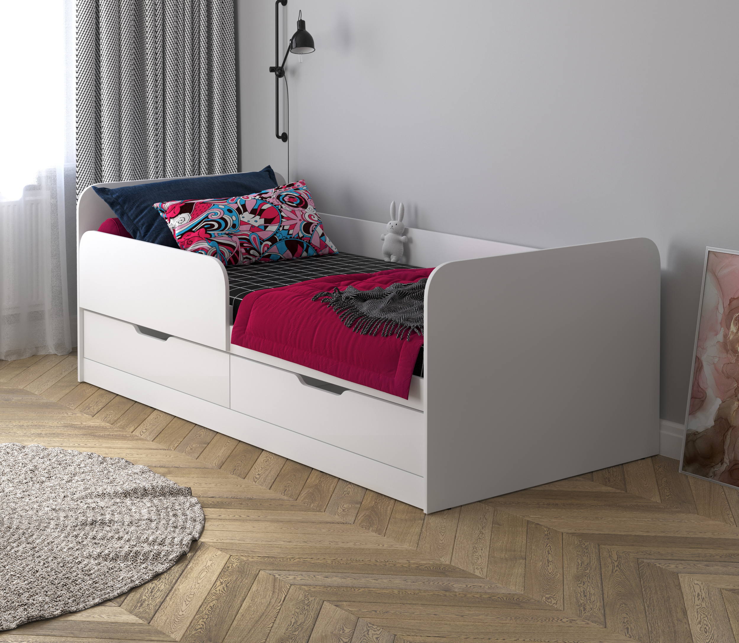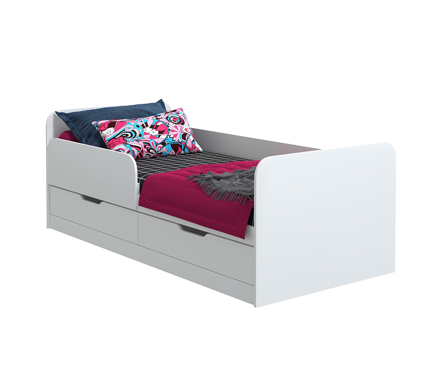 Отдельно стоящая кровать с шуфлядами и съёмным оградительным щитом. Имеет универсальные свойства сборки то есть может быть собрана зеркально для размещения в любом углу помещения. Рекомендуемый размер матраца: 90*200 см