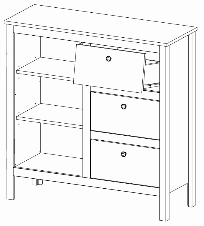 - Отделение с полками за распашной дверью и 3 выдвижных ящика на металлических роликовых направляющих;